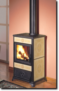 Stufa a legna rustica in ceramica decorata con struttura in acciaio e focolare di ampie dimensioni in ghisa.